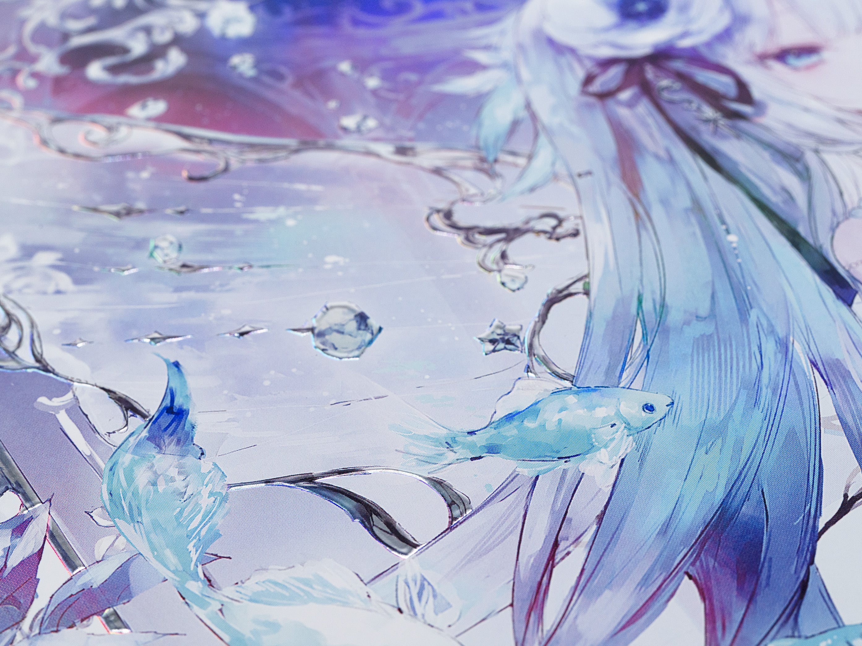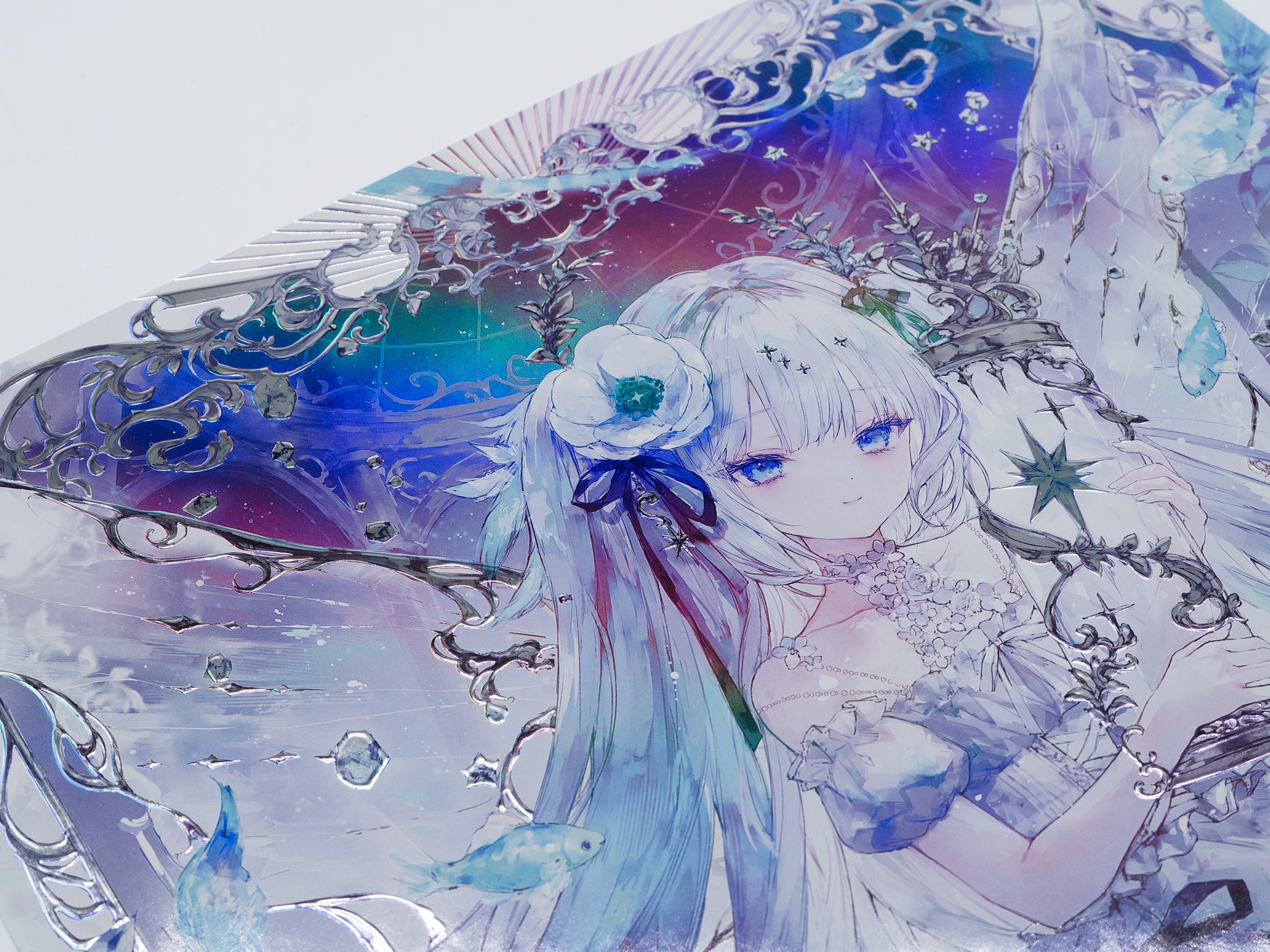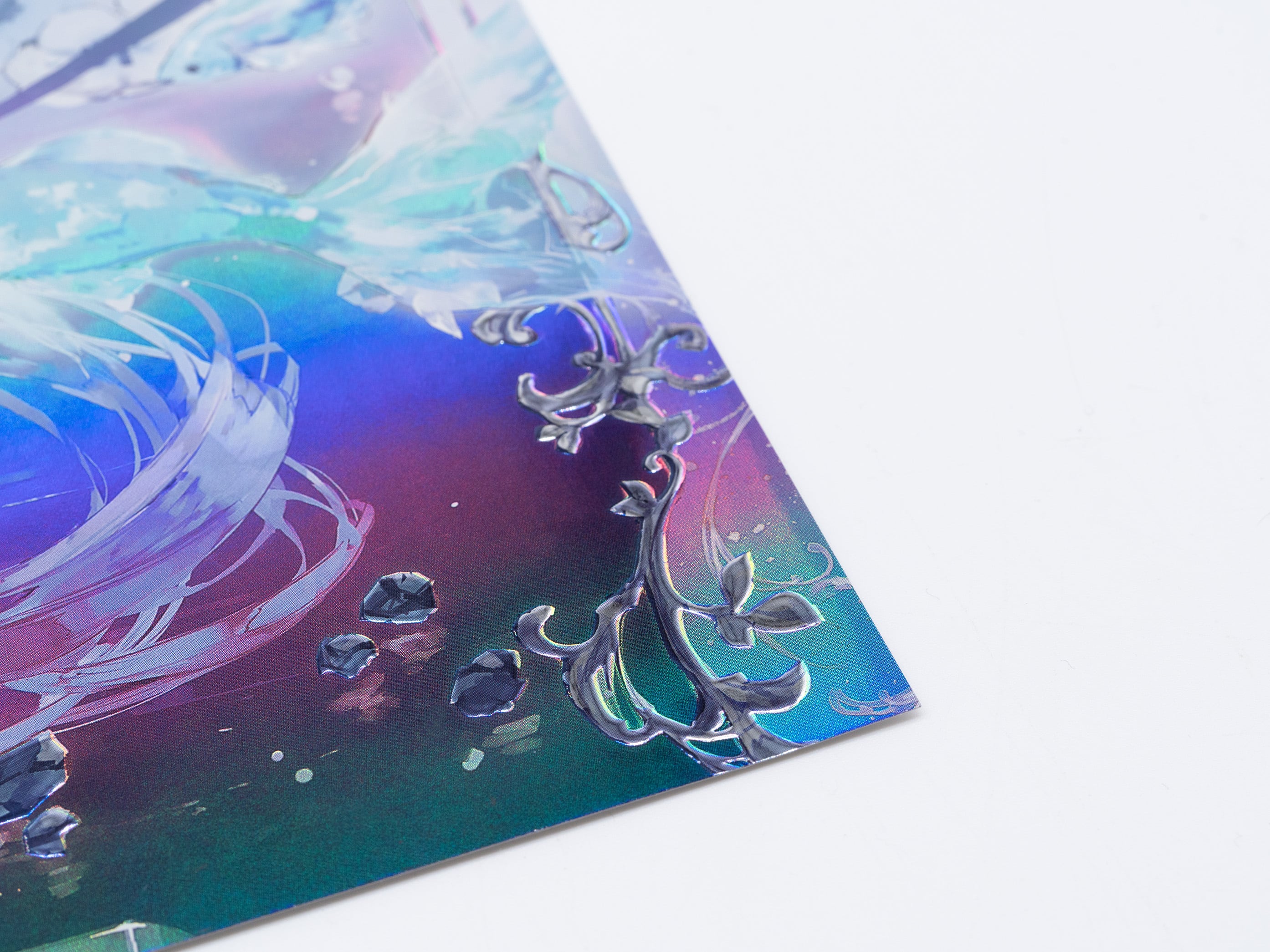 光が当たる角度によって、ホログラムの揺らめきと箔の立体的な反射が瞬時に切り替わり、まるでシャープに研ぎ澄まされたプリズムのようなコントラストを描き出します。