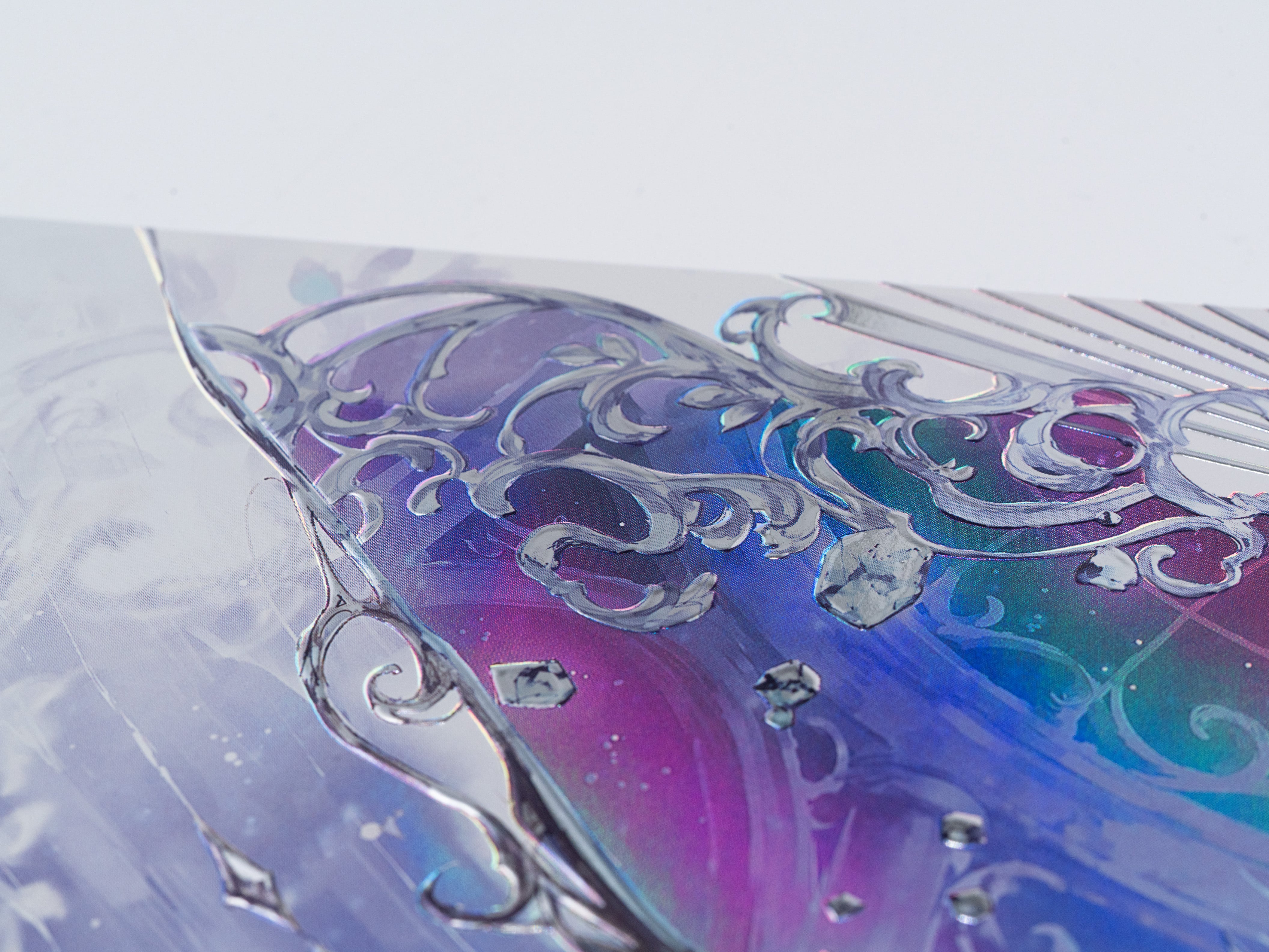 それに対し、Clearではあえてその層を省き、ホログラム蒸着紙の虹彩と厚盛り箔押しが直接ぶつかり合う鮮烈な輝きを実現しました。